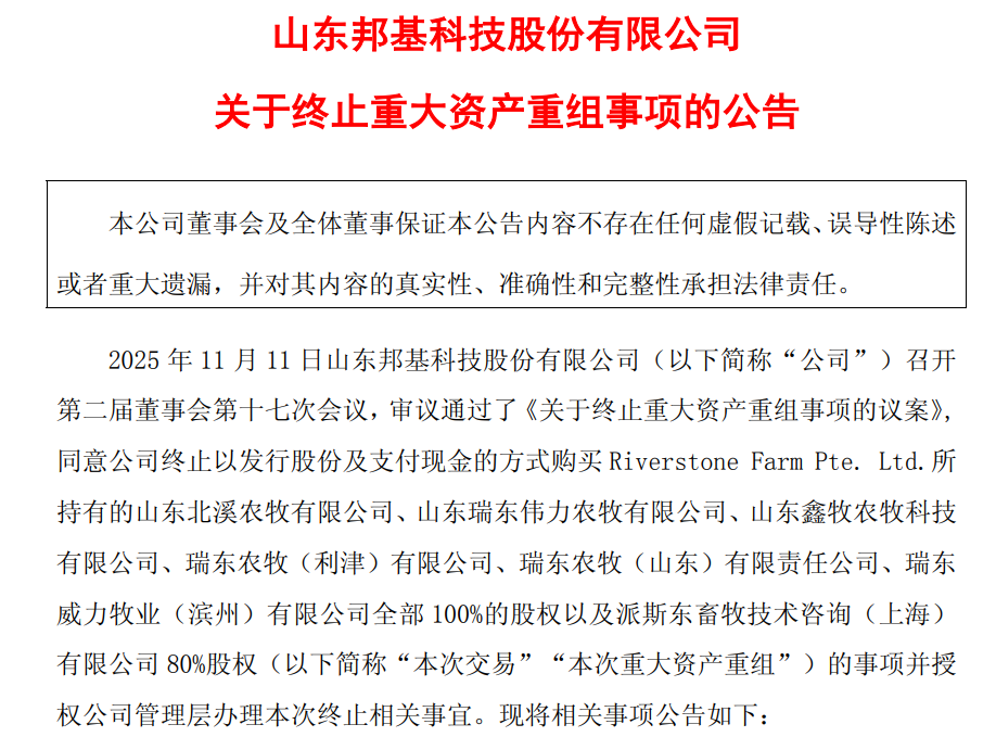 11月11日晚间,邦基科技(603151)公告称,11月11日,公司召开的第二届董事会第十七次会议审议通过了《关于终止重大资产重组事项的议案》,公司此前筹划收购7家农牧相关公司的计划夭折。