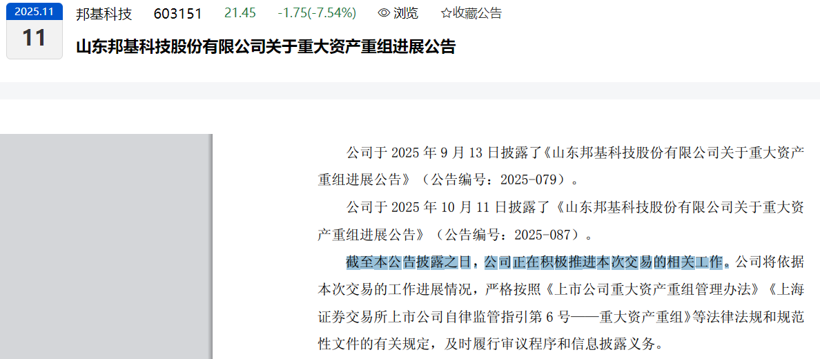 读创财经注意到,就在11月11日,邦基科技还刚刚发布了重大资产重组事项进展公告,称“公司正在积极推进本次交易的相关工作”,但短短一日相关事宜就“变脸”,公司原资产重组计划即告“猝死”。