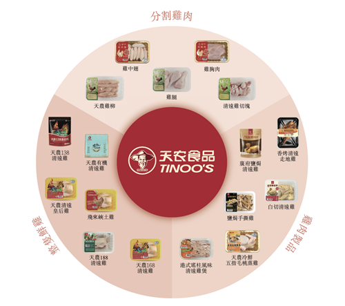 招股书显示,天农集团2015年开始生产生鲜及其他产品,现有产品主要包括整只生鲜鸡、分割鸡肉、半成品及熟食品,以自有品牌“天农”和“凤中皇”销售。