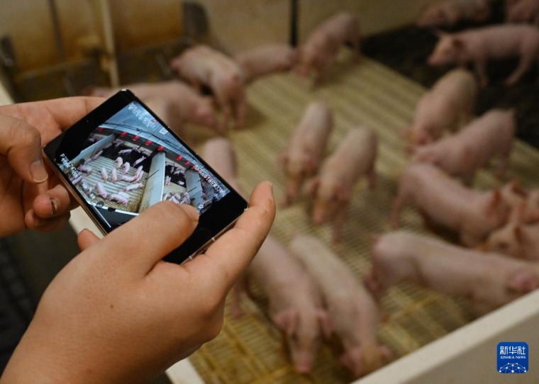 工作人员在内乡牧原肉食产业综合体通过手机查看仔猪段猪舍单元(8月20日摄)。新华社记者郝源摄