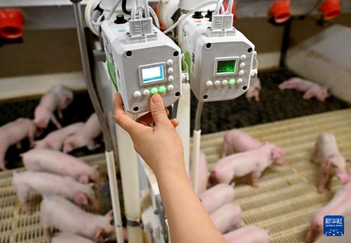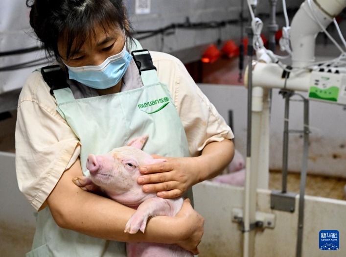 工作人员在内乡牧原肉食产业综合体仔猪段查看仔猪生长情况(8月20日摄)。新华社记者郝源摄