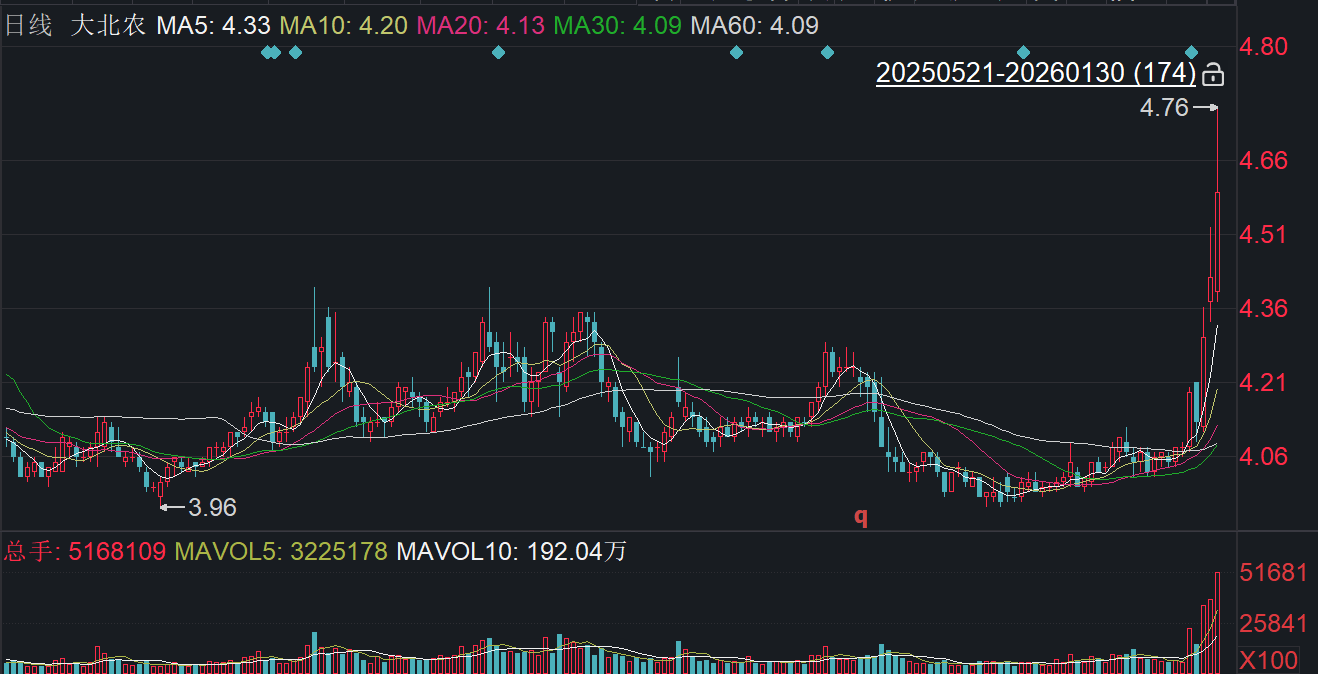 二级市场上,截至1月30日收盘,大北农上涨3.85%报4.59元/股,总市值约197.37亿元,近一月来公司股价累计上涨约15%。