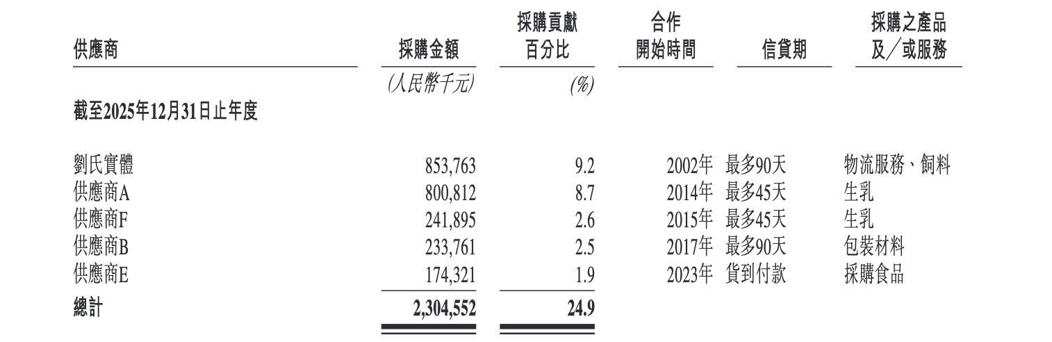 其中新希望乳业向供应商“刘氏实体”采购了8.5亿元的物流服务和饲料,采购贡献占比为9.2%。