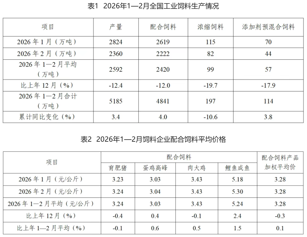 2026年1-2月,全国工业饲料产量5185万吨,同比增长3.4%