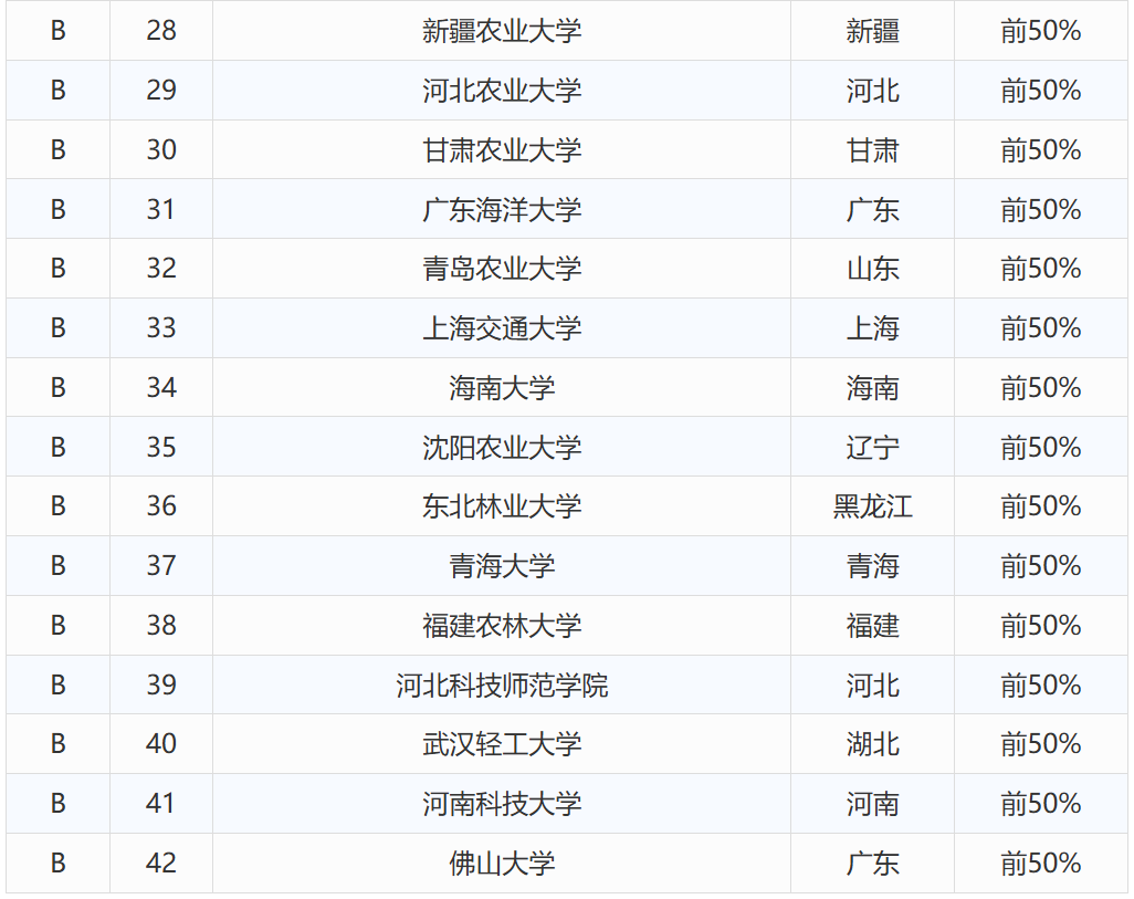 动物科学专业B类及以上高校共42所。2025年动物科学专业排名前列的院校分别为:中国农业大学(A+,前2%)、华中农业大学(A+,前2%)、西北农林科技大学(A,前10%)、南京农业大学(A,前10%)、浙江大学(A,前10%)、四川农业大学(A,前10%)、东北农业大学(A,前10%)、华南农业大学(A,前10%)、山东农业大学(B+,前25%)、湖南农业大学(B+,前25%)、扬州大学(B+,前25%)、西南大学(B+,前25%)、内蒙古农业大学(B+,前25%)、吉林大学(B+,前25%)以及江西农业大学(B+,前25%)等。