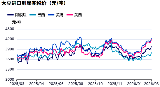 截至3月9日,巴西近月大豆到港完税价上涨至3800元/吨左右(含3%关税),低于美豆到港完税价的5300元/吨左右(含13%关税)。