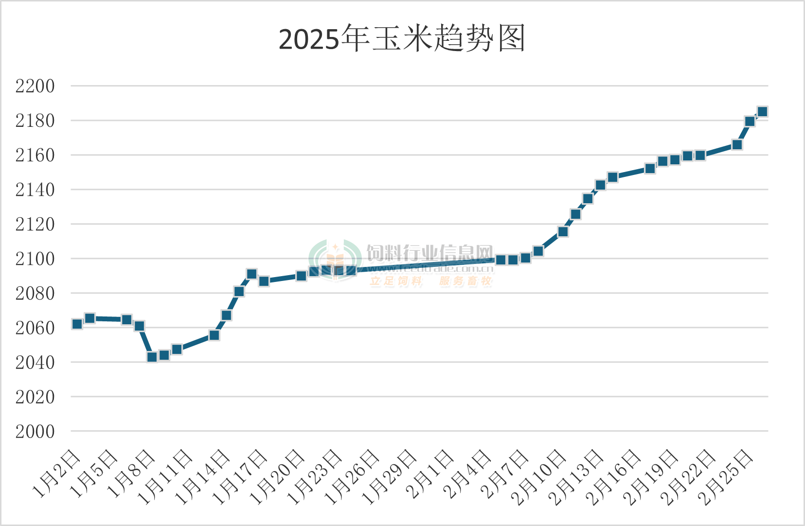 近来玉米走势偏强。国内持粮主体惜售强烈,市场有效供应量提升有限;中储粮托底效应增强;下游消费预期较好。受到多方因素提振,玉米仍会偏强。今日玉米均价为2184.95元,较2月初上涨85元,较上一日上涨6元。