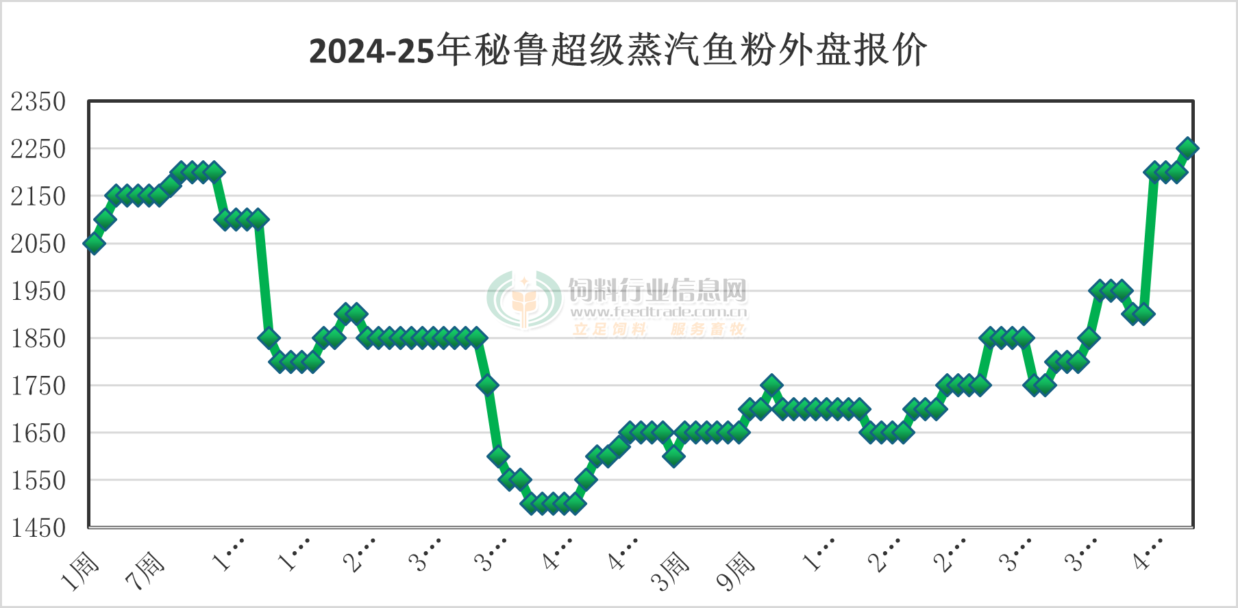 近来国内外鱼粉走势仍旧偏强。受禁捕消息等影响,捕鱼进度放缓,秘鲁鱼粉厂商心态坚挺。秘鲁新季超级蒸汽鱼粉预售参考价格为CNF2250美元/吨。