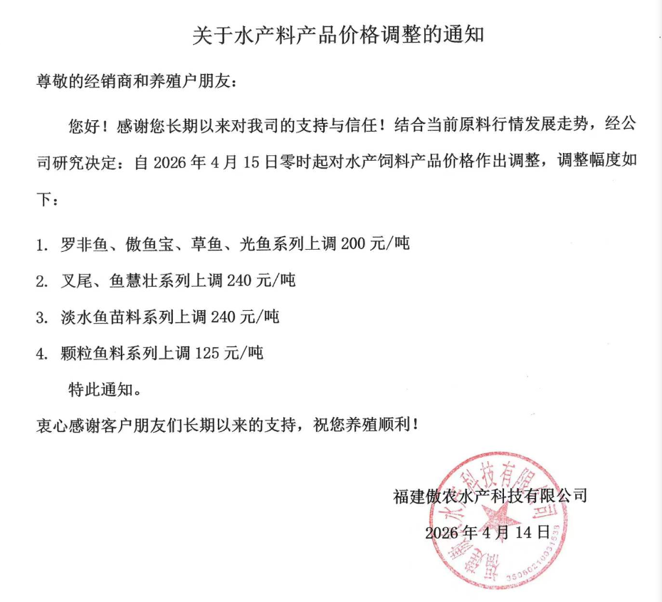 4月14日,福建傲农水产科技有限公司发布饲料涨价通知,自2026年4月15日零时起对罗非鱼、傲鱼宝、草鱼、光鱼系列上调200元/吨、叉尾、鱼慧壮系列上调240元/吨、淡水鱼苗料系列上调240元/吨、颗粒鱼料系列上调125元/吨。