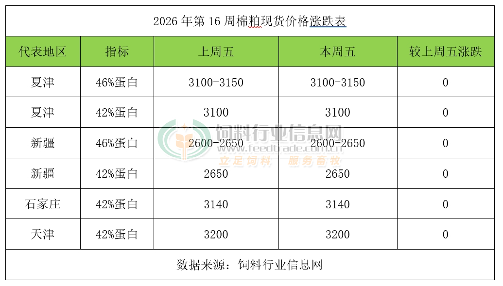 本周棉粕价格小幅下跌。随着海关通关节奏恢复正常,巴西到港量将持续攀升,后期油厂大豆供应将逐渐增加。国内养殖端逐渐转淡季,终端养殖亏损幅度扩大,需求低迷,倒逼原料价格回落,供应逐渐宽松后价格维持震荡偏弱,进一步利空棉粕行情。并且周内原料棉籽价格小幅回落,其中昌吉棉籽价格至1.275-1.325元。不过棉粕目前供应方面压力不大支撑棉粕行情。因此预计棉粕继续下跌空间不大,仍旧震荡偏强。截止目前,山东46%蛋白棉粕参考报价3100-3150元/吨,跌50元/吨;新疆46%蛋白棉粕参考报价2600-2650元/吨,跌50元/吨。