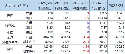 全球2025/26年度大豆期末库存预估上调为1.2441亿吨,12月预估为1.2237亿吨。2024/25年度1月预估为1.234亿吨。2023/24年度预估为1.1508亿吨。