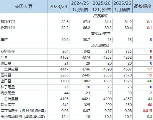 美国2025/26年度大豆产量预估上调为42.62亿蒲式耳,12月预估为42.53亿蒲式耳。2024/25年度1月预估为43.74亿蒲式耳。2023/24年度预估为41.62亿蒲式耳。