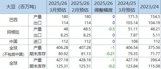全球2025/26年度大豆产量预估下调为4.2718亿吨,2月预估为4.2818亿吨。2024/25年度3月预估为4.2719亿吨。2023/24年度预估为3.964亿吨。