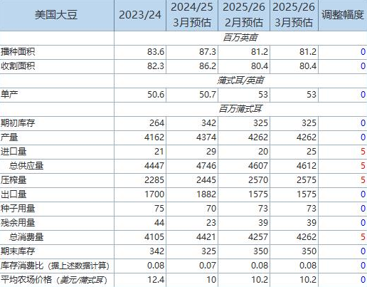 美国2025/26年度大豆期末库存预估为3.5亿蒲式耳,2月预估为3.5亿蒲式耳。2024/25年度3月预估为3.25亿蒲式耳。2023/24年度预估为3.42亿蒲式耳。