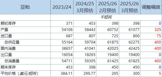 美国2025/26年度豆粕年初库存预估为39.8万短吨,2月预估为39.8万短吨。2024/25年度3月预估为45.3万短吨。2023/24年度为37.1万短吨。