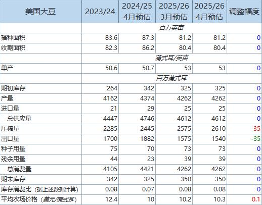美国2025/26年度大豆期初库存预估为3.25亿蒲式耳,3月预估为3.25亿蒲式耳。2024/25年度4月预估为3.42亿蒲式耳。2023/24年度预估为2.64亿蒲式耳。