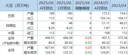 全球2025/26年度大豆产量预估上调为4.2741亿吨,3月预估为4.2718亿吨。2024/25年度4月预估为4.2815亿吨。2023/24年度预估为3.964亿吨。