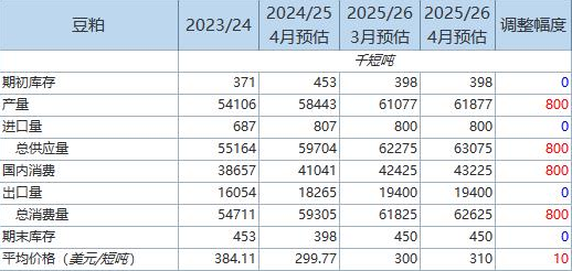 美国2025/26年度豆粕年初库存预估为39.8万短吨,3月预估为39.8万短吨。2024/25年度4月预估为45.3万短吨。2023/24年度为37.1万短吨。