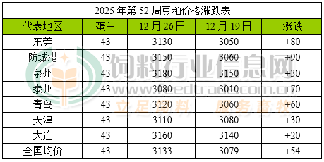 国内油厂大豆供应充裕,在开机压榨水平较高的情况下豆粕产量较大,下游饲料养殖企业以随用随采为主,出货缓慢后库存偏高,供应宽松令其承压,但市场传言进口大豆通关延迟政策将持续至5月,到港延后将令大豆及豆粕库存持续消耗,增强工厂上调豆粕价格。据饲料行业信息网统计数据显示,沿海地区43%蛋白豆粕价格为3133元/吨,较上一周上涨54元/吨。随着元旦的到来后国内饲料厂将为春节前旺季提前备货,饲料厂及养殖场对豆粕的需求将增加,支撑豆粕价格维持偏强行情,但整体供应宽松将限制豆粕价格上涨幅度。