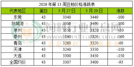 虽说原油涨价导致海运费上涨,加之近期到港大豆通关缓慢后库存下降,豆粕供应逐渐收紧后对价格提供支撑,但因海关即将放宽对进口大豆中杂草检疫,后续大豆通关进度估计有所加快,届时豆粕产量有望增加,并且在目前生猪养殖持续亏损的情况下,需求逐渐清淡令豆粕价格继续偏弱运行。据饲料行业信息网统计数据显示,沿海地区43%蛋白豆粕价格为3307元/吨,较上一周下降93元/吨。随着部分到港的巴西大豆陆续通关,预计工厂大豆库存将增多,豆粕产量随之增大,在需求复苏有限的情况下豆粕价格或继续震荡偏弱运行。
