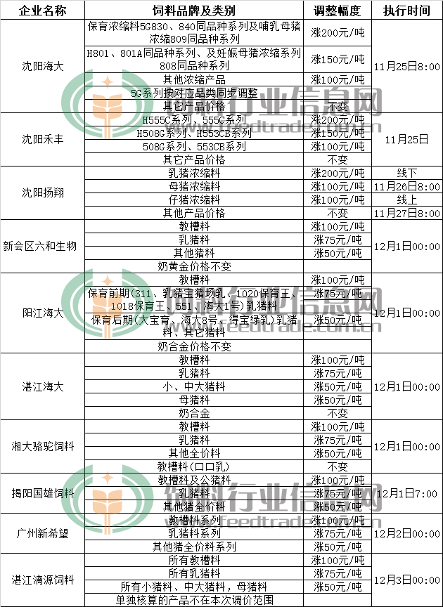 虽然近期豆粕价格波动不大,但是进口鱼粉价格上涨明显,加之玉米价格也出现了一定程度的上调,叠加近期气温逐渐下降后一年中的生猪养殖需求逐渐转旺,对饲料的需求有所增加。这导致部分饲料企业在11月下旬开始纷纷上调饲料价格,后续有不少企业纷纷接连上调猪产品类饲料价格,其中海大、禾丰、新希望及扬翔等品牌均在列,全价料系列中教槽料普遍上涨100元/吨,乳猪料普遍上涨75元/吨,其他猪料上涨50元/吨;而浓缩料系列涨幅最大,其中保育及哺乳浓缩料上涨200元/吨,怀孕母猪浓缩料涨150元/吨,具体上涨幅度及调价时间如下表所示: