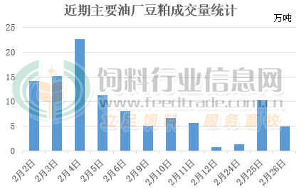 美盘大豆价格持续上行带动进口大豆价格跟随上行,但国内大多以采购南美大豆为主,进口大豆成本上涨幅度受限。国内春节长假期间工厂大部分停机,油厂大豆库存有所增加。待春节假期过后工厂陆续恢复开机,压榨大豆数量有所增加,豆粕产量出现缓慢的增加。但因饲料养殖企业自2月中旬开始拿货较少,大多以消耗前期库存为主,市场购销冷清,油厂豆粕库存处于增加的状态,油厂豆粕供应宽松,导致进口大豆成本上行对豆粕市场带来的支撑力度被削弱。