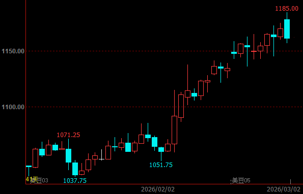 近日美国国内的生物燃料掺混政策有望出台支撑豆油价格,令美国大豆压榨需求强劲,加之阿根廷大豆产区干旱引发减产预期,而巴西产区洪涝等灾害令大豆收割上市进度放缓,叠加中东地区爆发的美伊战争让全球原油价格飙升,多因素利多美国大豆需求后支撑CBOT大豆期价主力合约最高涨至1185美分/蒲式耳,为2024年6月14日以来高点。