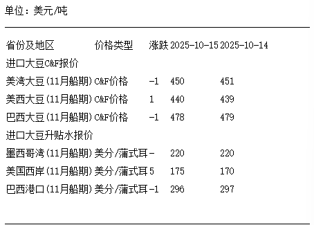 10月15日进口大豆到国内港口C&F及升贴水报价