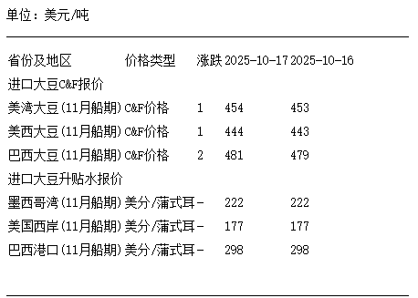 10月17日进口大豆到国内港口C&F及升贴水报价