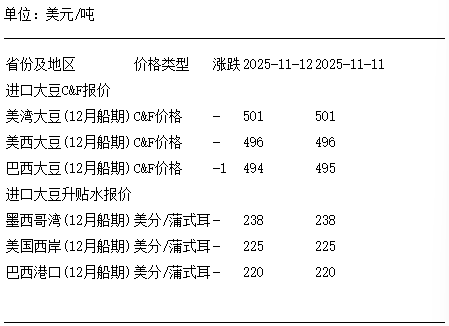 11月12日进口大豆到国内港口C&F及升贴水报价