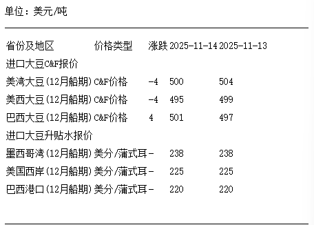 11月14日进口大豆到国内港口C&F及升贴水报价