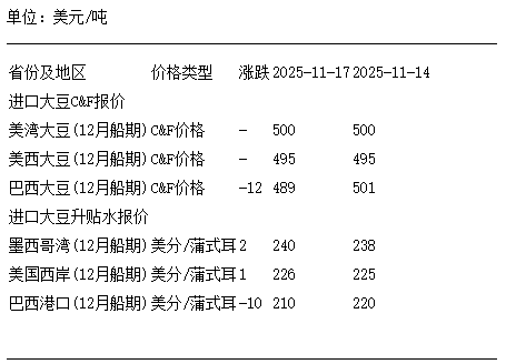 11月17日进口大豆到国内港口C&F及升贴水报价