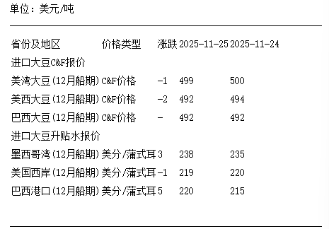 11月25日进口大豆到国内港口C&F及升贴水报价