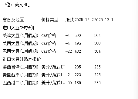 12月2日进口大豆到国内港口C&F及升贴水报价