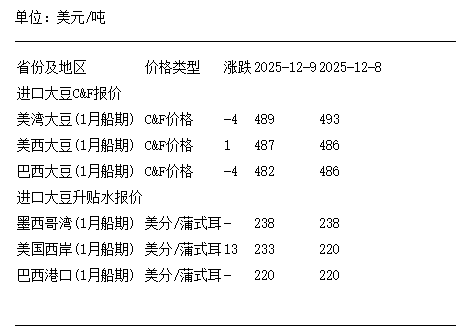 12月9日进口大豆到国内港口C&F及升贴水报价