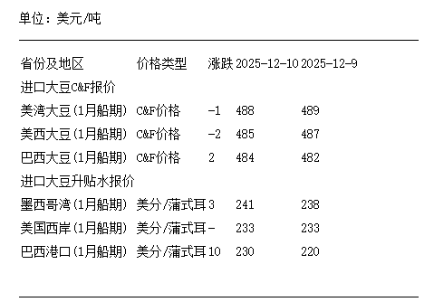 12月10日进口大豆到国内港口C&F及升贴水报价