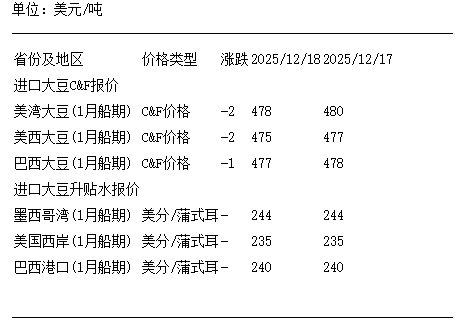 12月18日进口大豆到国内港口C&F及升贴水报价