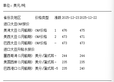 12月23日进口大豆到国内港口C&F及升贴水报价