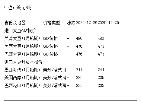 12月26日进口大豆到国内港口C&F及升贴水报价