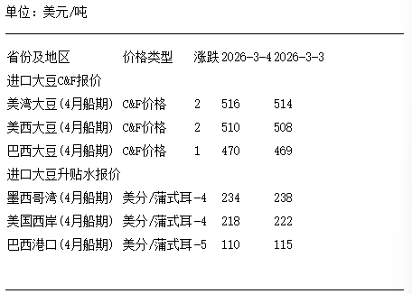 3月4日进口大豆到国内港口C&F及升贴水报价