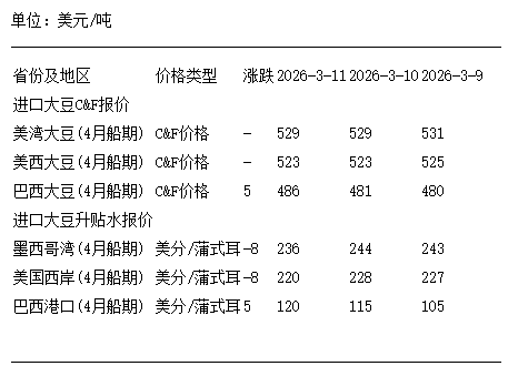 3月11日进口大豆到国内港口C&F及升贴水报价