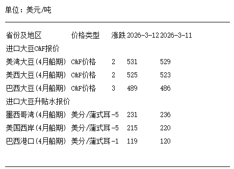 3月12日进口大豆到国内港口C&F及升贴水报价