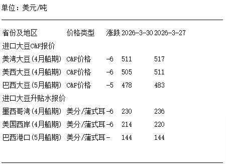 3月30日进口大豆到国内港口C&F及升贴水报价