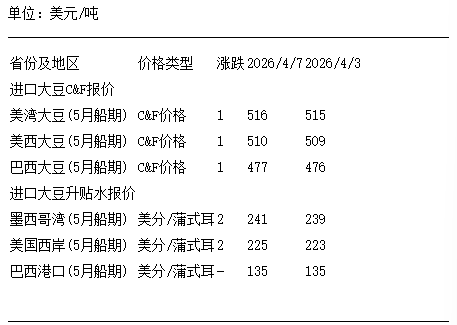 4月7日进口大豆到国内港口C&F及升贴水报价