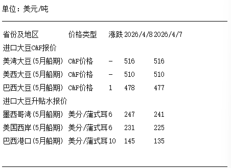 4月8日进口大豆到国内港口C&F及升贴水报价