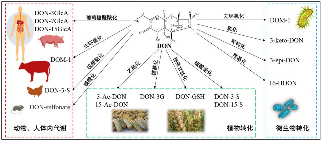 DON是一种单端孢霉烯类真菌毒素,广泛污染小麦、玉米等谷物及其制品,其不仅具有细胞毒性、免疫毒性、急性毒性、遗传毒性以及致癌性,还可与其他真菌毒素产生协同效应。DON在产品加工或生物代谢过程中可通过糖基化、氧化、乙酰化等途径转化为多种衍生物(图1),这些衍生物难以被传统检测技术识别,且部分可在消化过程中逆转为DON,或产生与DON相似的毒性作用,导致实际暴露风险被低估。