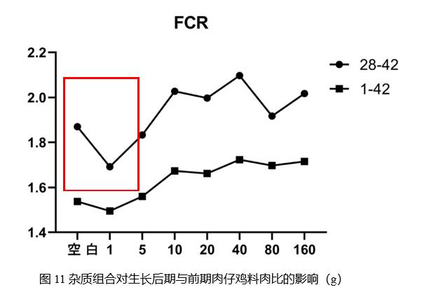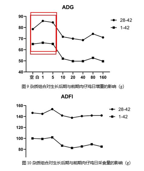 由图9、10、11可知,在对生长后期与全期肉鸡生产性能影响方面,空白组和1倍、5倍剂量组的采食量和体增重均显著高于多倍剂量组,以上三组饲料效率同样最优,多倍剂量组(5倍以上)肉鸡的生长性能比较接近,全期以160倍剂量组体增重最低,全期饲料效率以40倍剂量组和160倍剂量组最差。