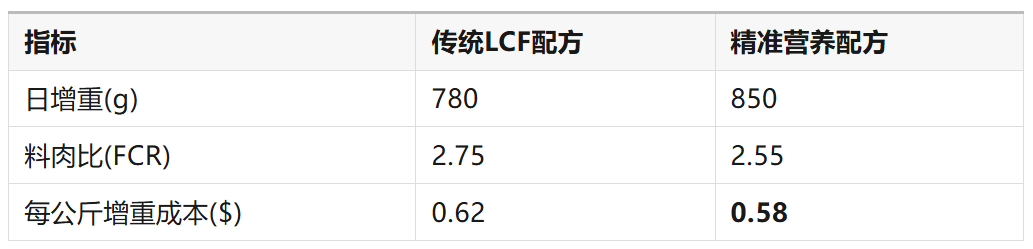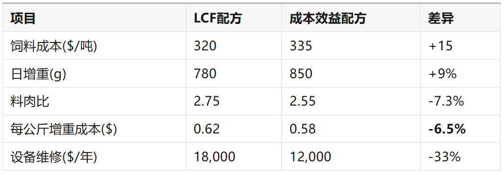 LCF配方虽每吨饲料便宜$15,但因FCR恶化,每公斤增重成本反而高出6.9%。