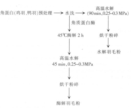 羽毛→预处理(除杂脱水)→高温高压水解→烘干→羽毛粉成品