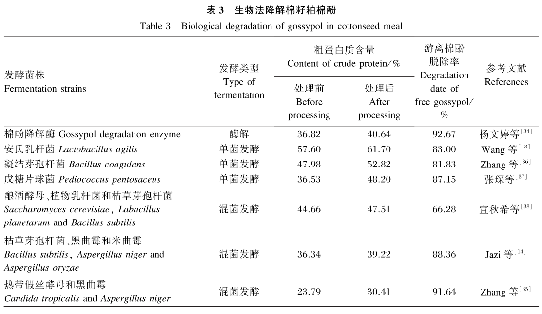 目前棉籽粕脱酚常用的生物法包括酶解法和微生物发酵法(表3)。杨文婷[34]研究发现,在温度40℃、水分含量35%的条件下,添加5%的棉酚降解酶经过2h可脱除92.67%的游离棉酚,比热带假丝酵母ZD-3进行固态发酵后的游离棉酚脱除率高4.46%,且前者极大地缩短了脱毒时间,大大地提升了棉籽粕脱毒效率。微生物发酵法根据发酵的类型可分为单菌发酵和混菌发酵,该方法不仅能提高棉酚降解率,还能够降低物理法和化学法对棉籽粕中蛋白质的功能和结构产生的破坏作用。Wang等[18]研究发现,安氏乳杆菌在体外接种浓度为5%的条件下,39℃连续发酵5d,棉酚降解率高达83%,粗蛋白质含量提高了4.1%。此外,Zhang等[35]选用热带假丝酵母和黑曲霉对棉籽粕进行混菌发酵处理,游离棉酚的降解率可达91.64%,粗蛋白质含量及其体外消化率也得到明显提高。
